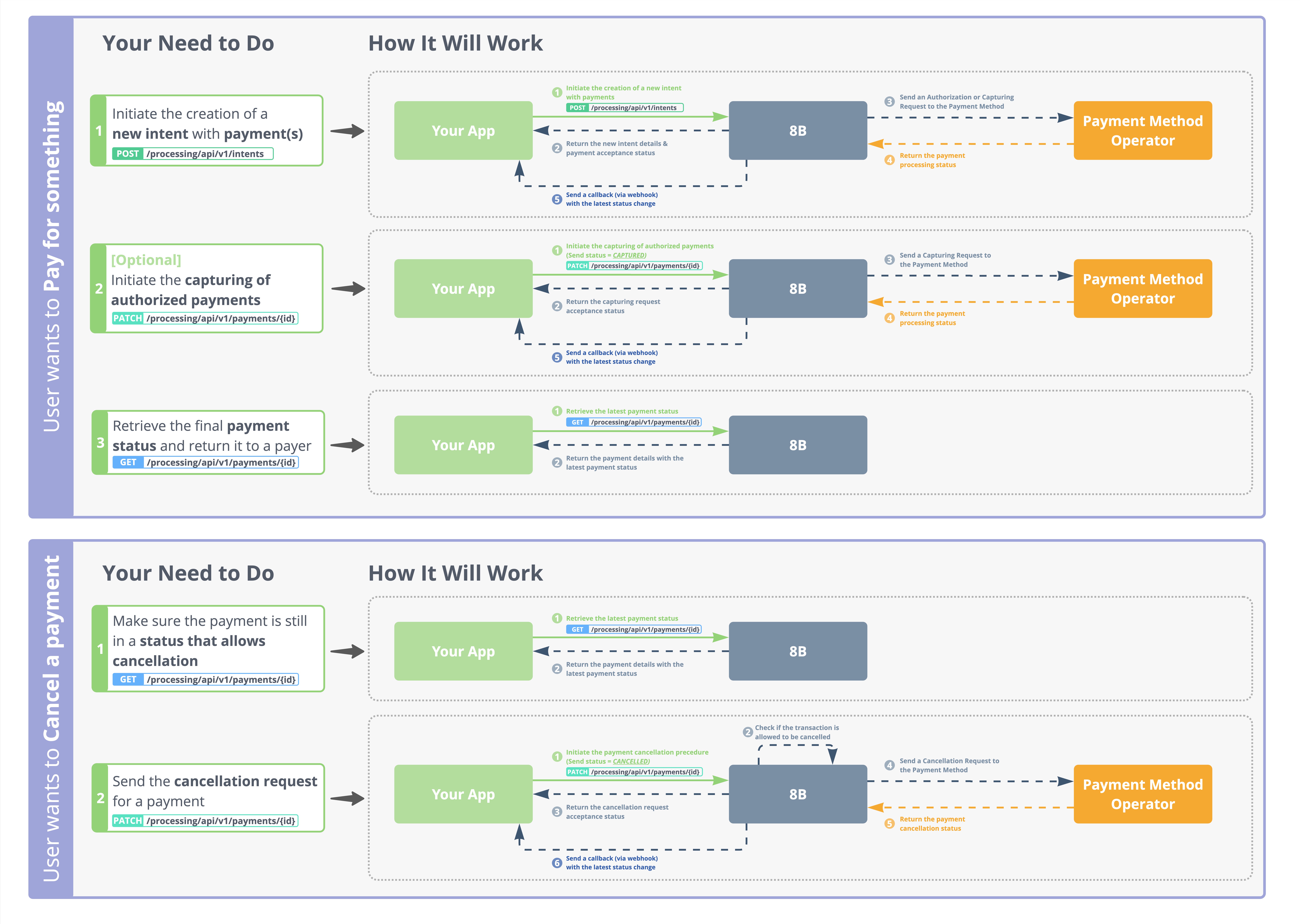 This section introduces core API methods and status flows for handling payments, including intent creation, authorisation, capture (manual or auto), and cancellation, with support for multiple payment methods