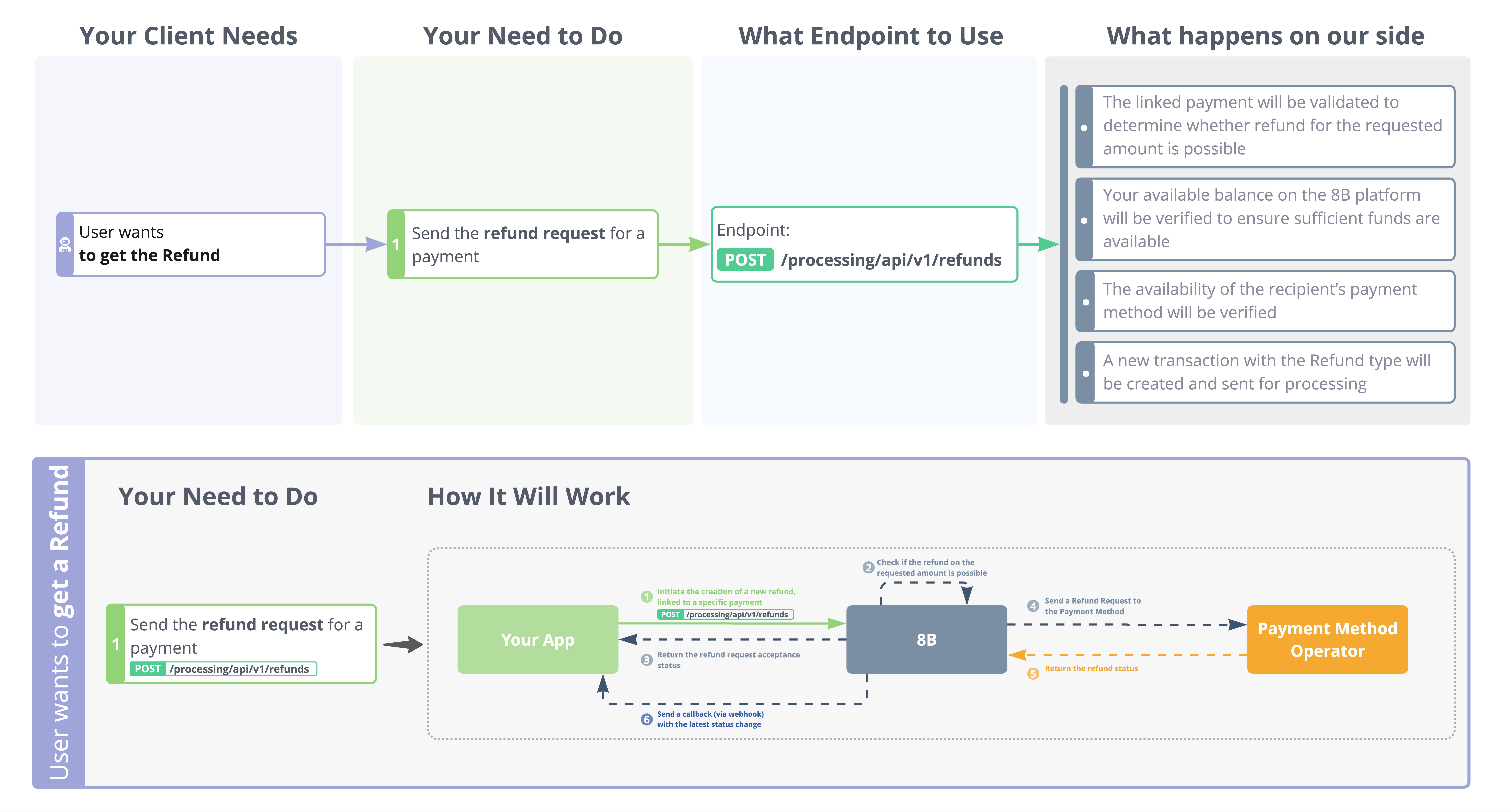 - The refund process involves internal validation (e.g. transaction eligibility, account balance) and subsequent submission to the Payment Method Operator.